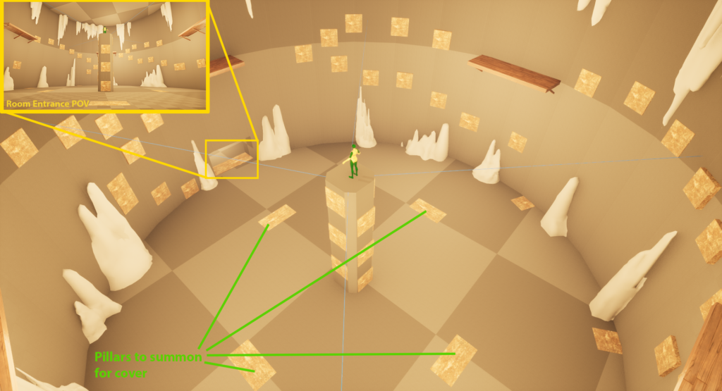After the corridor, the player enters the Boss room where they will fight Avatar Kyoshi’s spiritual form. Kyoshi is standing on a big pillar at the center of a cylinder cavern.