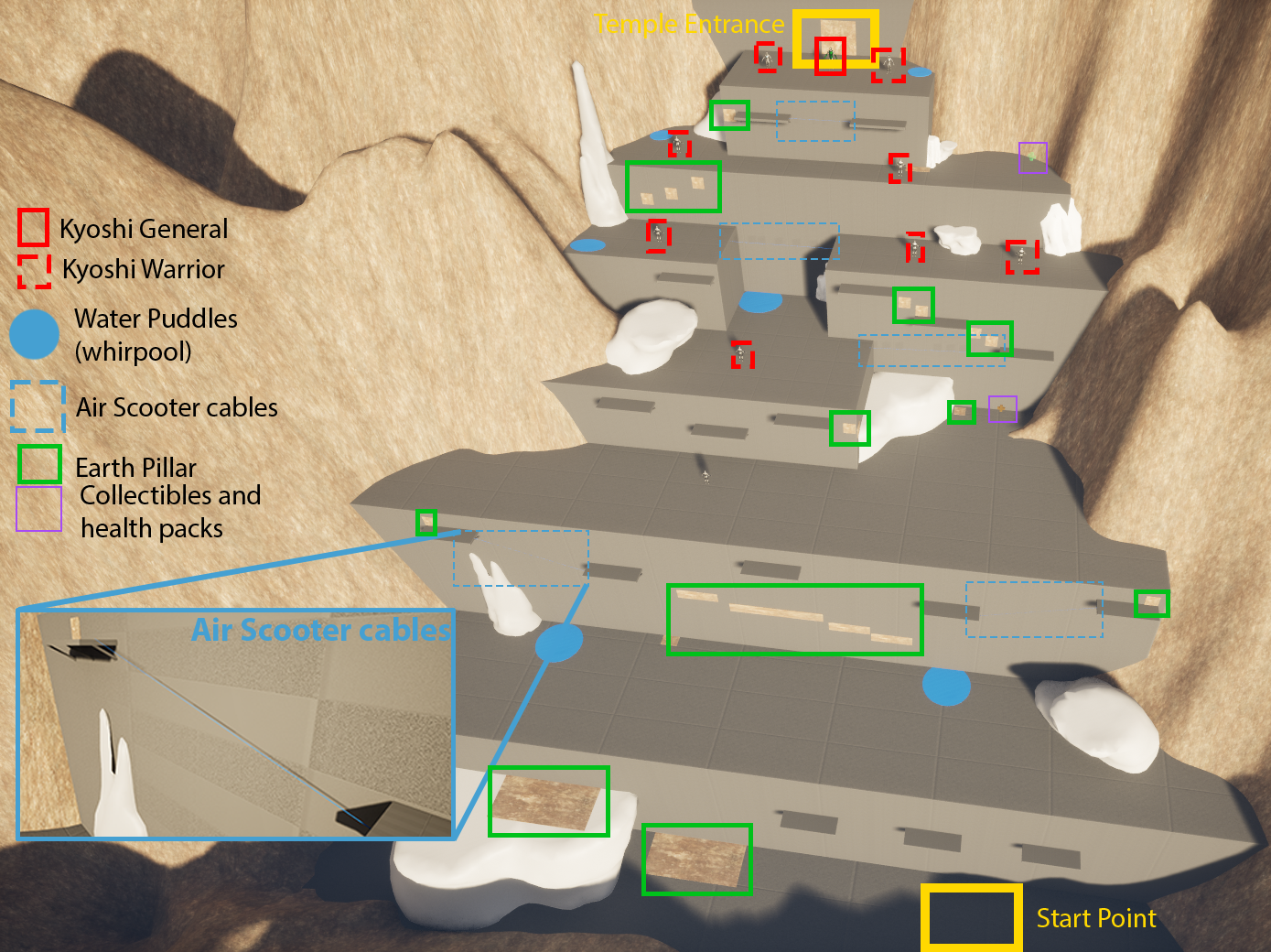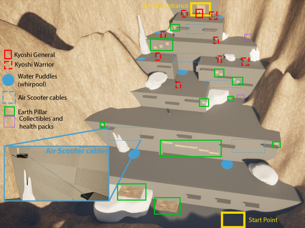 After entering the temple, the player then has to go through a short cavern-like corridor, where they will encounter a few more Kyoshi Warriors and a few obstacles.