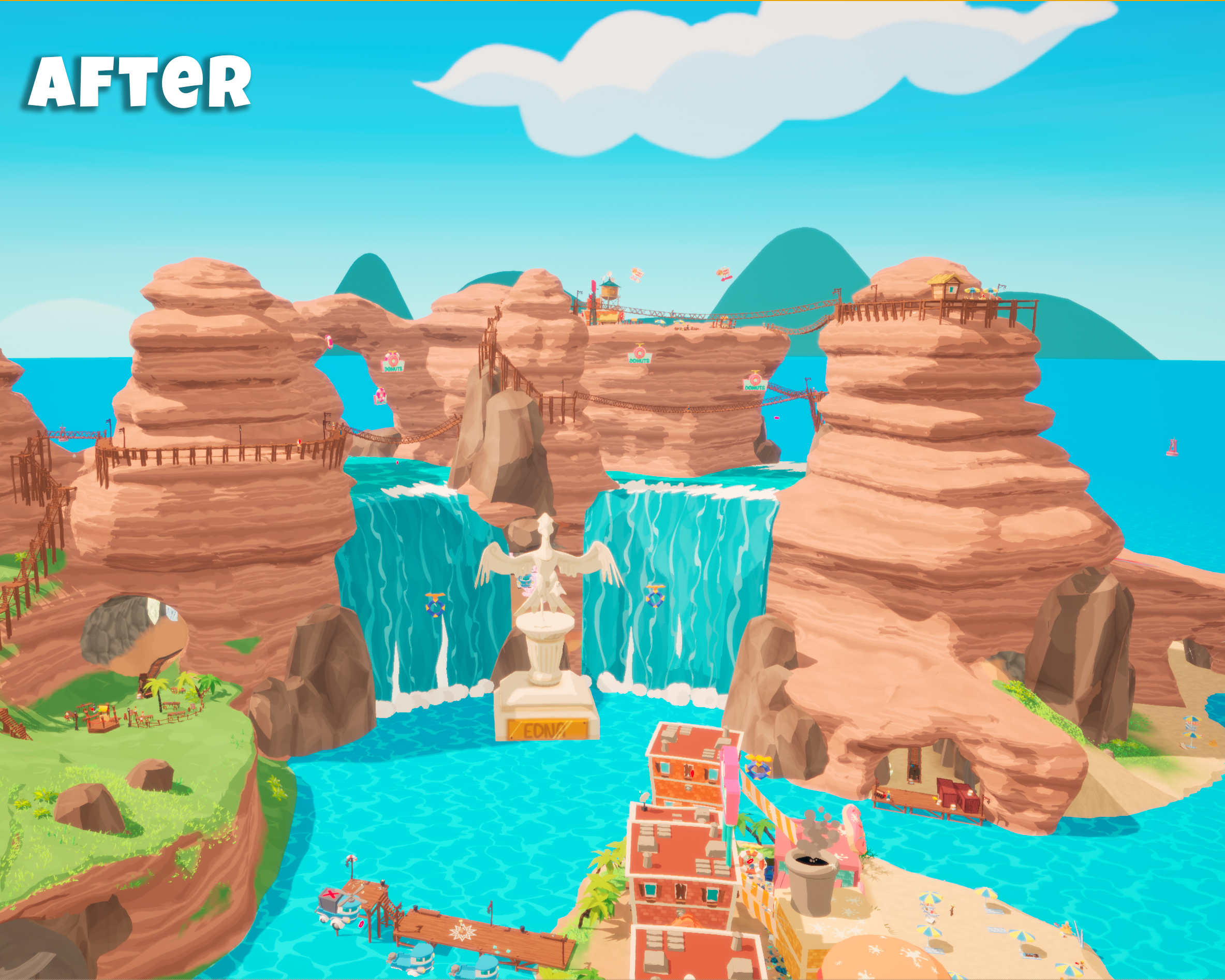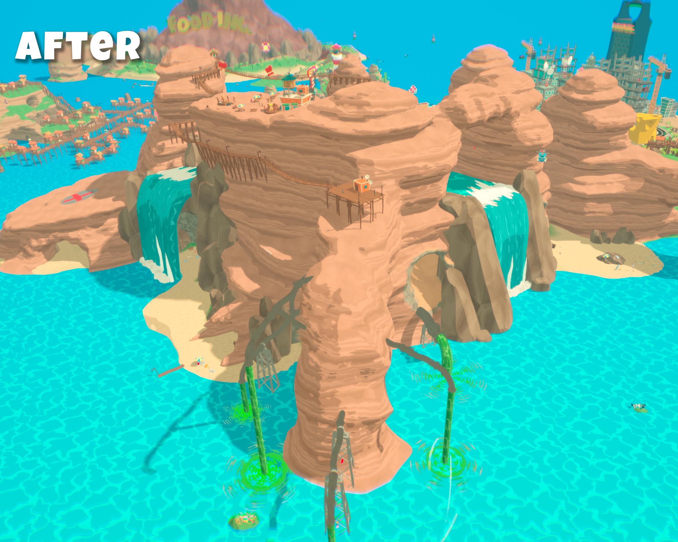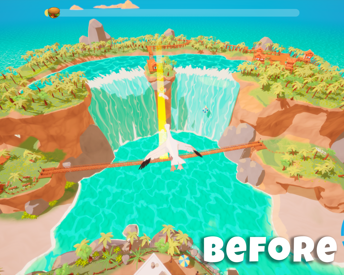 - Created an Island offshore with Stilts and tunnels that the player can fly through