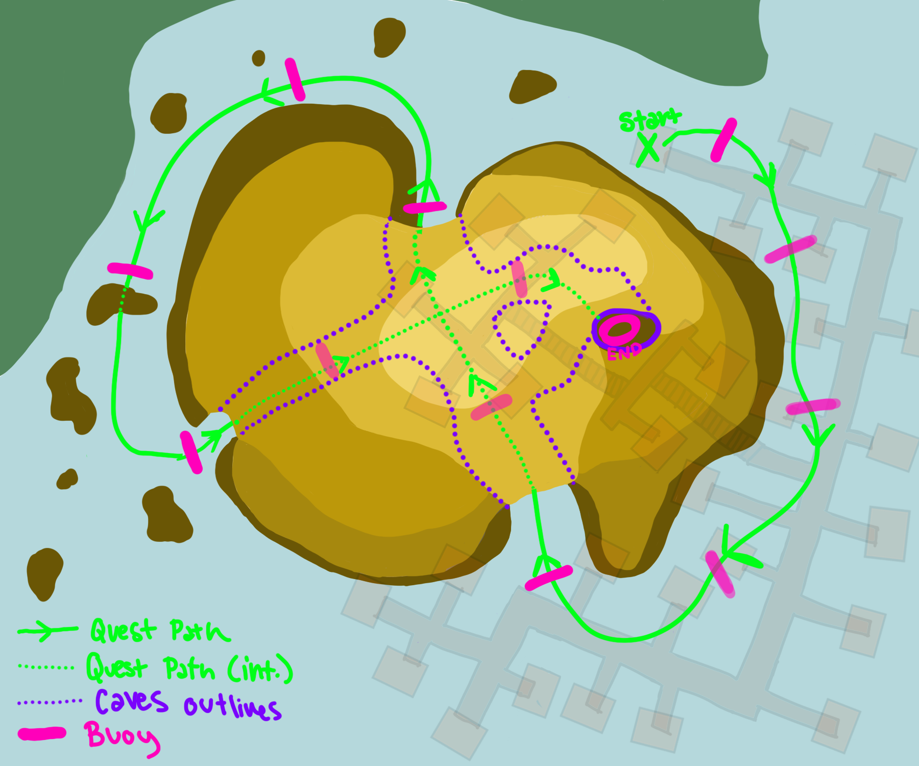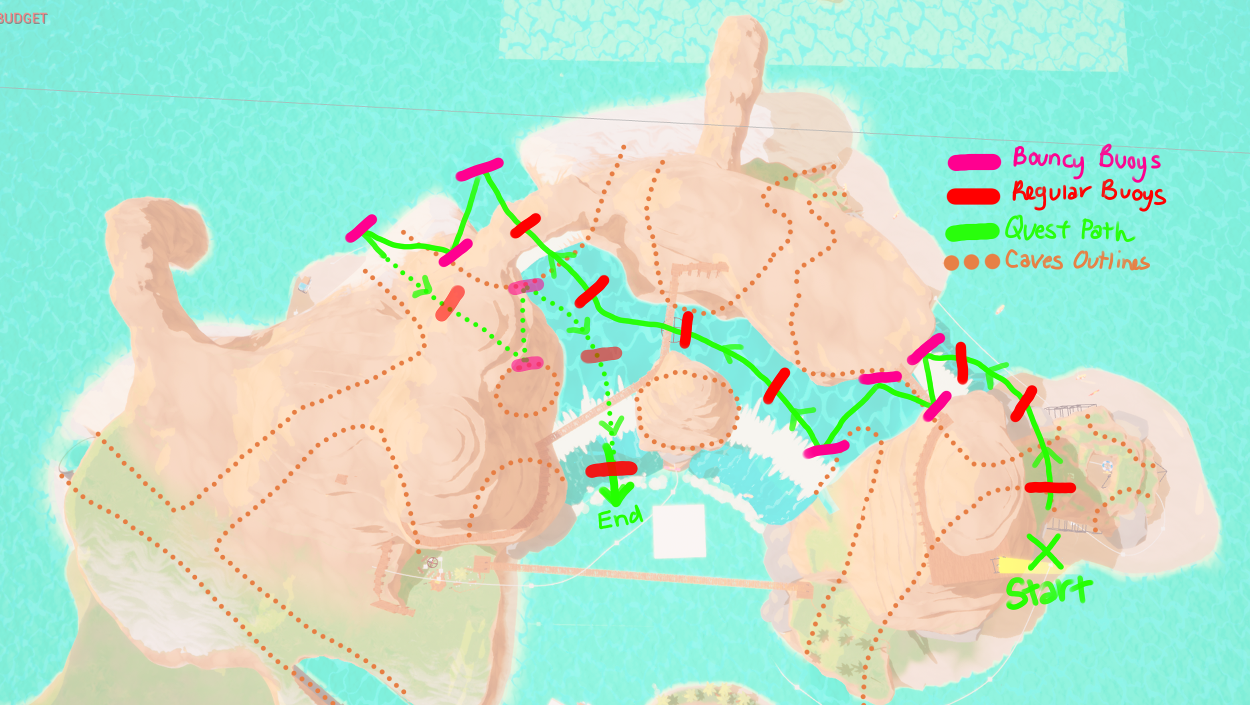 - Used rock formations, tunnels and the environnement to create a fun parkour with buoys