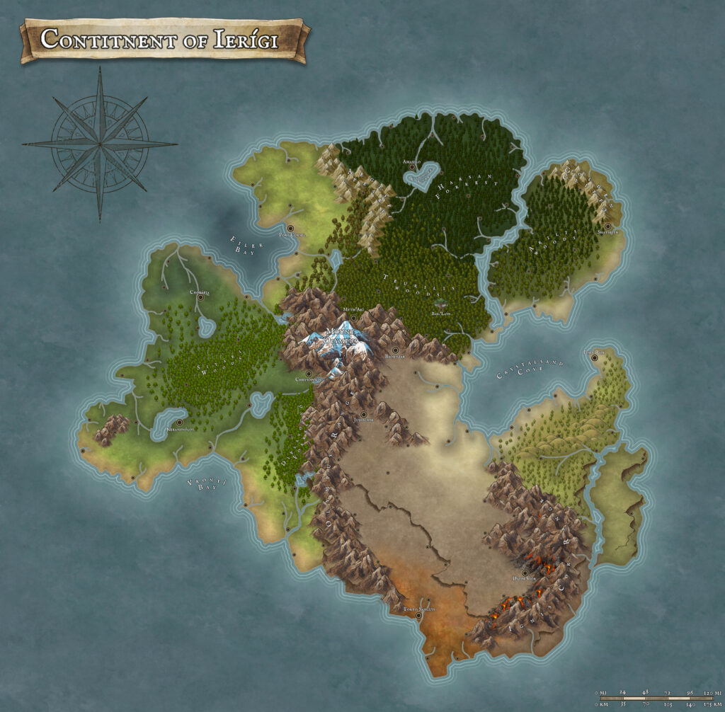 Ierígi is the main continent in the world. The continent is split into 12 different regions, all located around Mount Olympus, which is at the center, and each dedicated to one of the 12 Greek Olympians dieties. Those 12 regions are divided in 3 empires. The 3 empires all have distinct history and culture, each taking inspiration from different civilizations of Classical Antiquity.